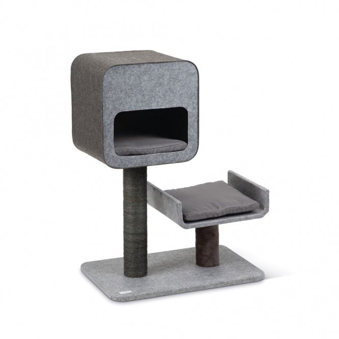 The Tinka cat tree is a very compact scratching post that still offers everything cats need to satisfy their needs for sleeping and scratching. The cat house and the scratching post with its platform are covered in felt.