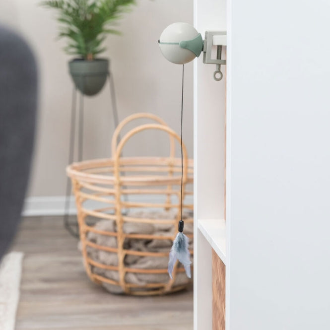 Our automatic cat toy "Catch It" can be easily attached to various surfaces up to 4 cm thick. A battery-operated mechanism causes the toy, attached to a string, to move up and down at irregular intervals, stimulating your feline friend's natural instincts to play and catch. For variety, you can choose between a fish or feather toy – whichever your cat prefers. The toy automatically switches off after 15 minutes.